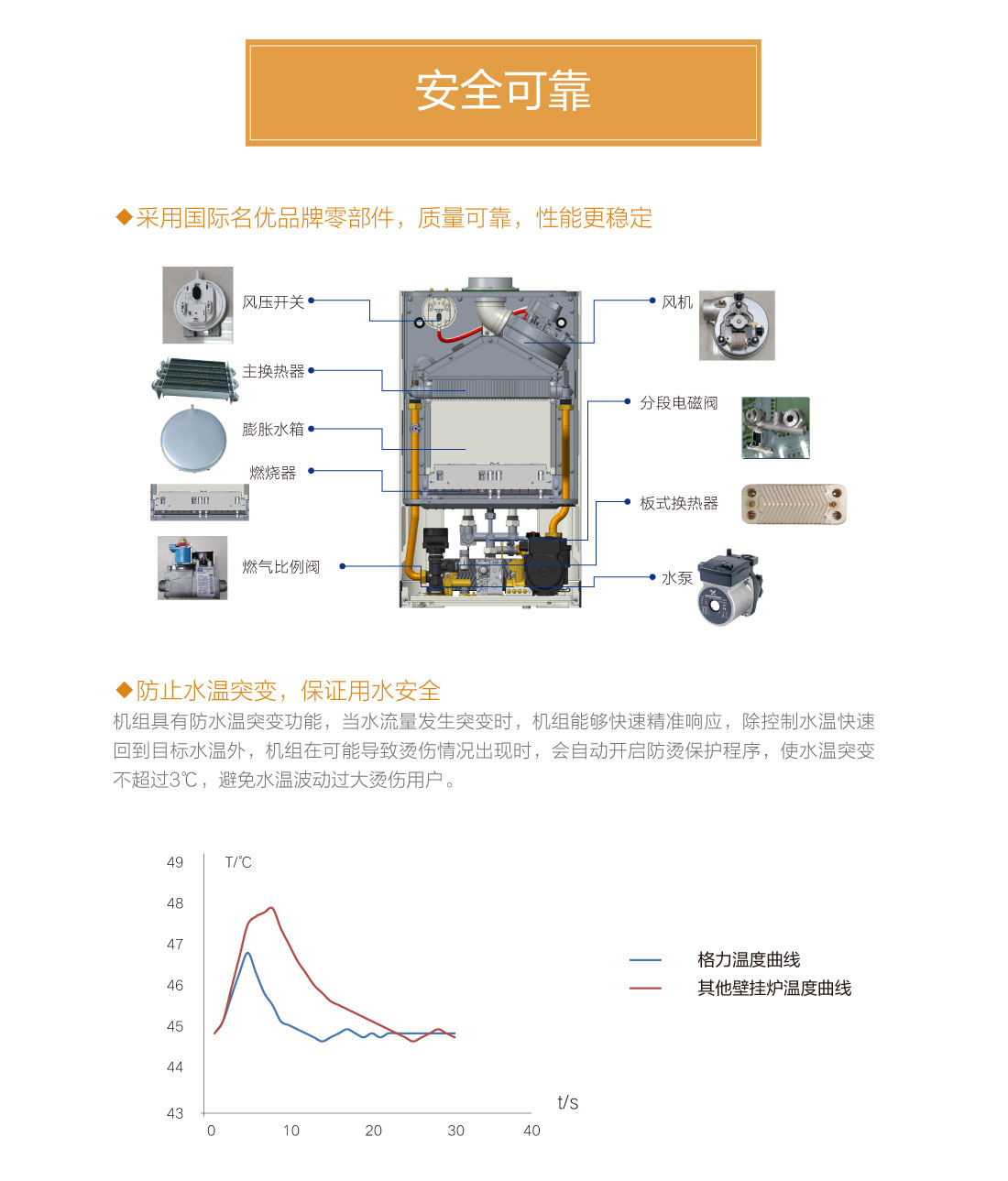 分段燃烧,20%~100%宽域功率输出,防止夏季水温过高过烫,智能水温调节,±0.5℃精准控温,温度设定广,生活热水35℃~60℃,暖气片供暖用水30℃~80℃,地暖供暖用水30℃~60℃