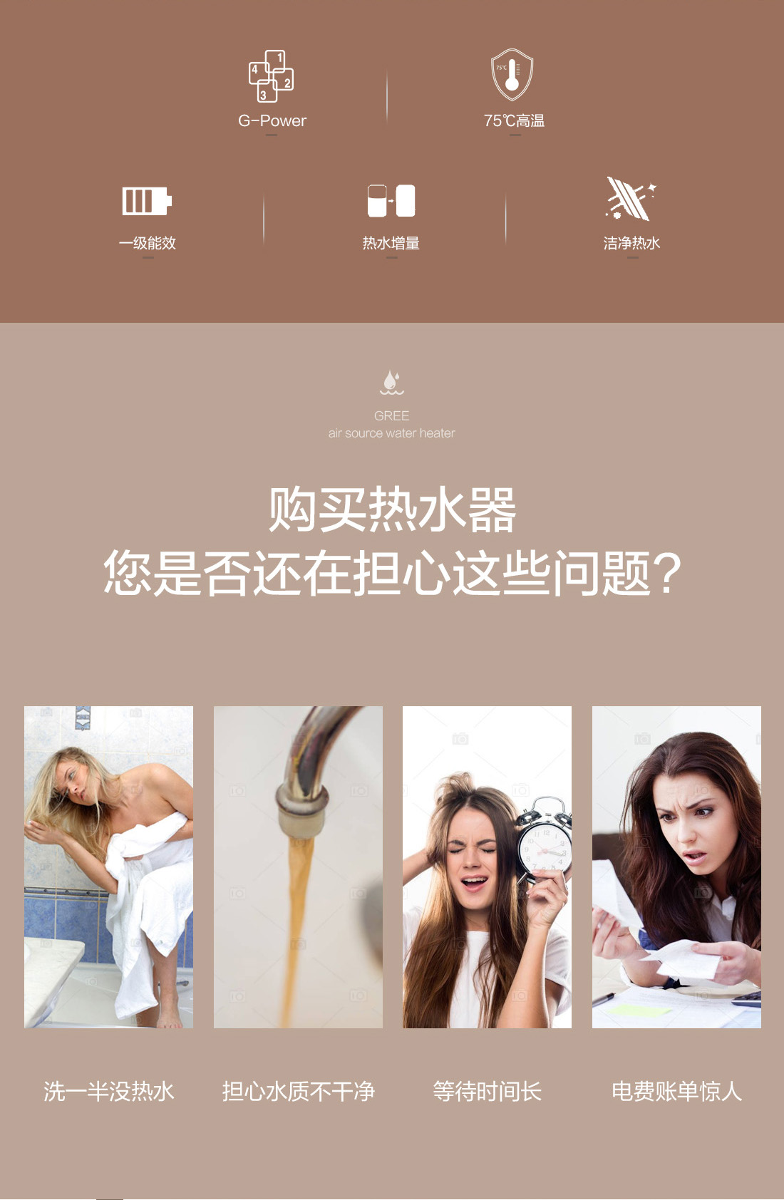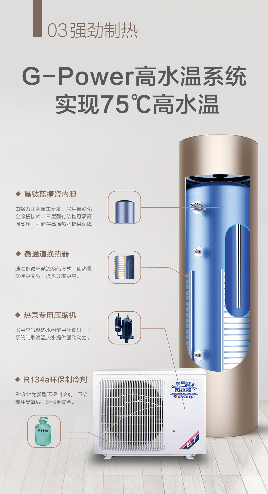 高温大水量,沐浴畅快享,搭载G-power高水温系统,成就水温更高,水量更大的空气能热水器,更达1级能效,省电高达75%,全家人畅快享受的沐浴选择。