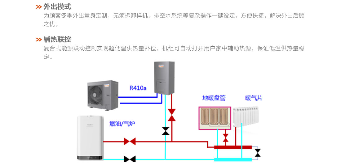 采用直流变频技术,制热量范围8.5~16kW,稳定运行环境温度范围-20℃~28℃、出水温度范围25~55℃,具有低温强热、节能高效、稳定可靠等特点,适用于集中供暖覆盖不足的农村及城郊地区以及城市独立供暖的公寓、复式楼、别墅、单元写字楼、餐厅、商店、娱乐场所等空间.