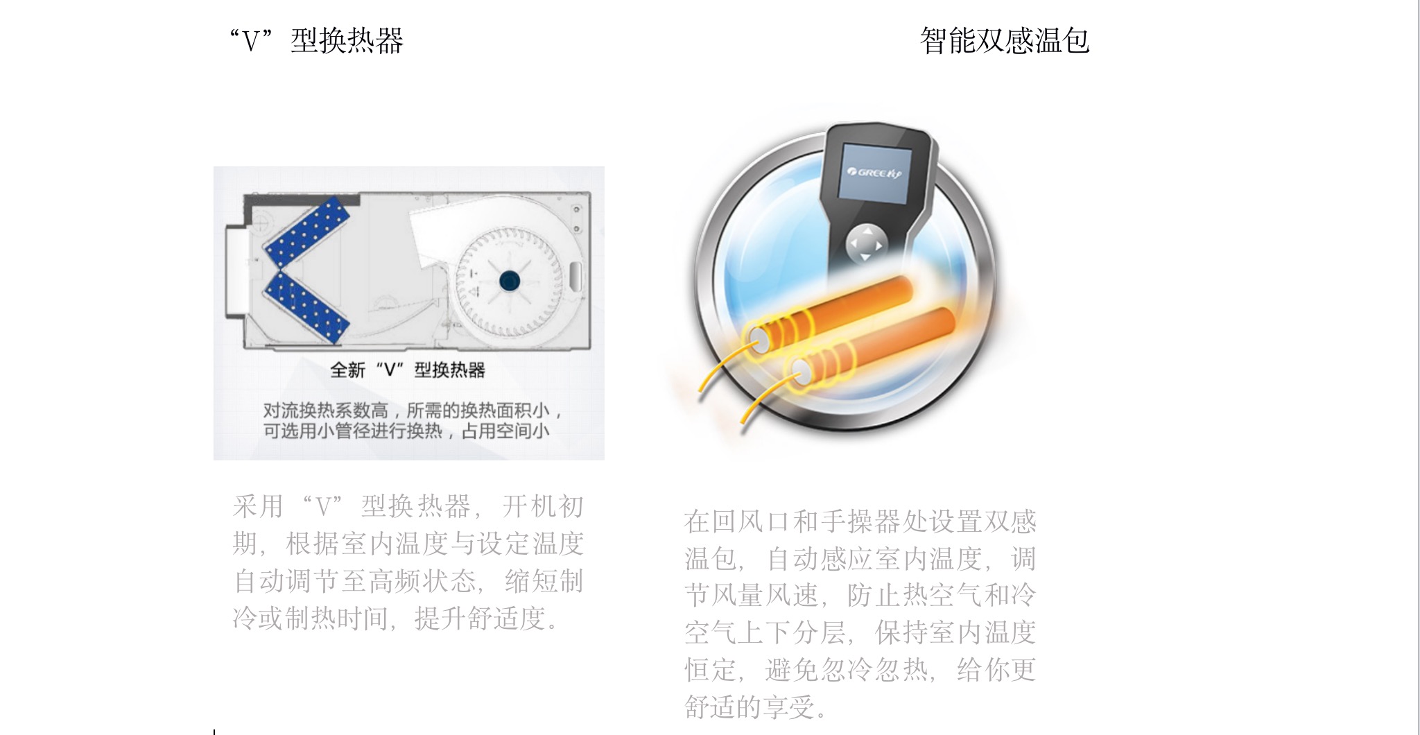 采用“V”型换热器,开机初期,根据室内温度与设定温度自动调节至高频状态,缩短制冷或制热时间,提升舒适度